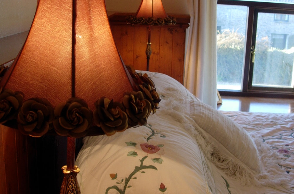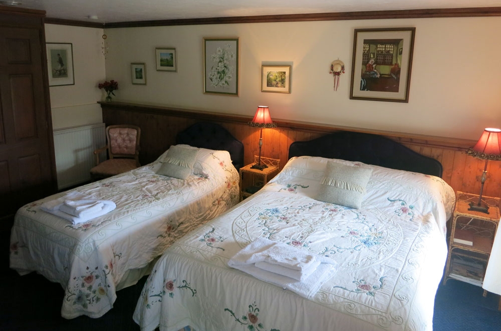 The ‘Swallow Barn’, en-suite family bedroom is situated in a beautifully converted barn opposite the medieval farmhouse on the other side of the courtyard garden. This twin/double bedroom, situated on ground floor level, with three steps into the room, has a double bed, single bed, en-suite bathroom and parking for your vehicle onside the bedroom. The en-suite bathroom has a basin, toilet and bath with shower, fluffy white towels and a variety toiletries to meet your needs. Whilst the bedroom has a hair dyer, well stocked tea and coffee tray including Devon fudge, radio alarm clock, TV and free Wi-Fi.