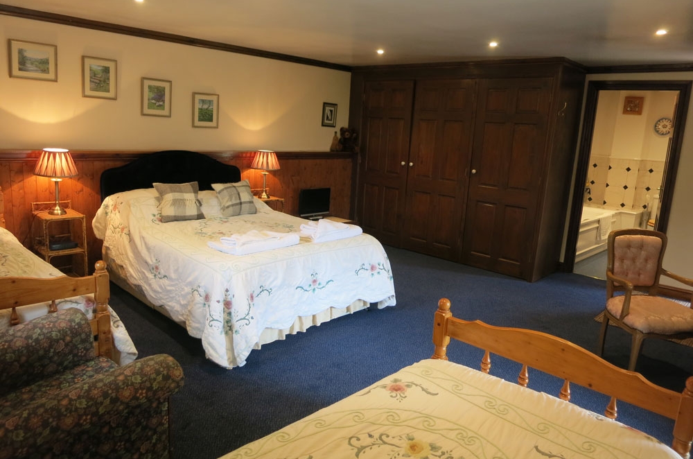 The ‘Barley Barn’, en-suite family bedroom is situated in a beautifully converted barn opposite the medieval farmhouse on the other side of the courtyard garden. This large family bedroom with en-suite bathroom , situated on ground floor level, with three steps into the room, has a double bed, two single beds and ample space for a cot or single size camp bed. The en-suite bathroom has a basin, toilet and bath with shower, fluffy white towels and a variety toiletries to meet your needs. Whilst the bedroom has a hair dyer, well stocked tea and coffee tray including Devon fudge, radio alarm clock, TV and free Wi-Fi.