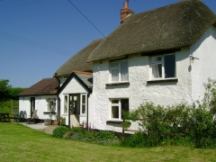 Chocolate Box thatched 2 bedroom cottage sleeping up to 5. A beamed double bedroom with ensuite shower, 1 room double & single beds, family bathroom. Kitchen, dining & sitting rooms downstairs. Oil central heating. Free WiFi. BT TV Detached with lawned garden, a gate leads to fields & riverbank to wander along. We welcome one well behaved dog in this property. Suitable for couples or a family.