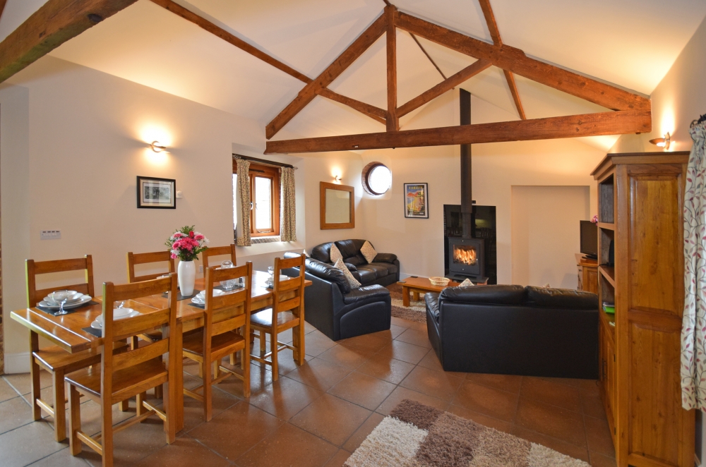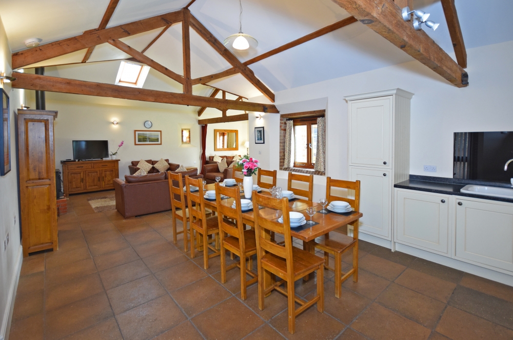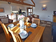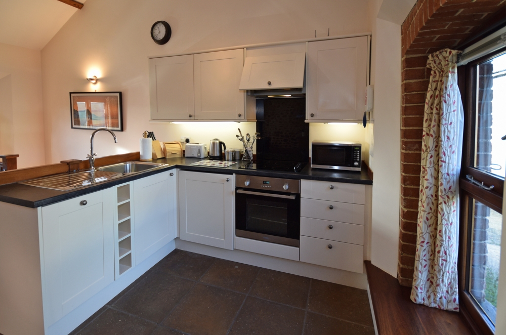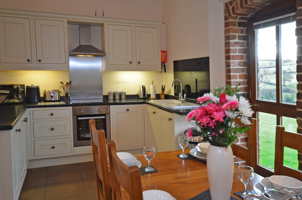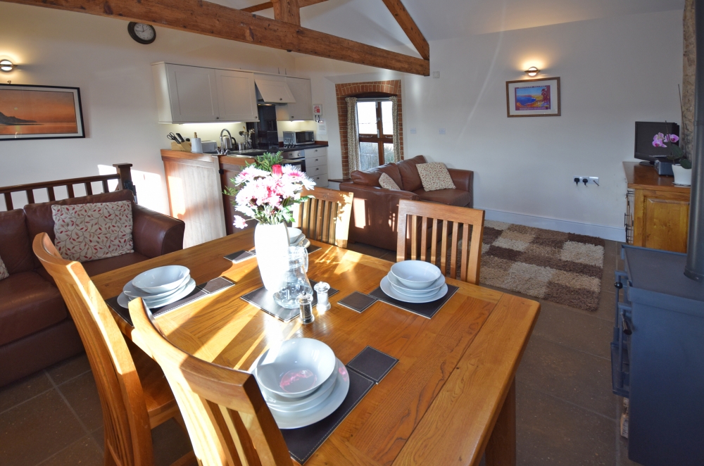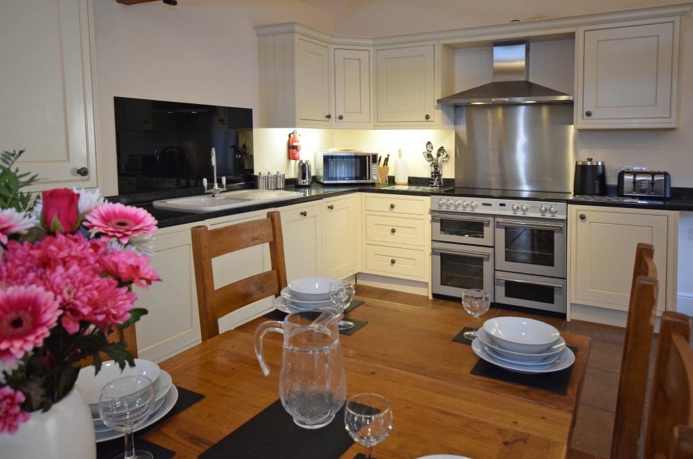 The Wheel House has a spacious, open-plan, well-equipped Kitchen/Dining/Lounge area, including an double electric oven and hob, microwave oven, kettle, full upright size fridge/freezer, toaster, dishwasher and a washer/dryer. The Lounge has a log burner, and the banquet table.