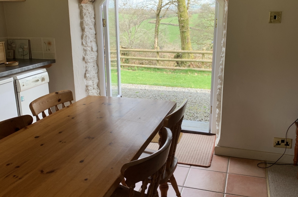 Downstairs through the front door is a porch and cloakroom with WC and wash-basin, and a door into a large open-plan lounge and kitchen/dining area. The kitchen is very well-equipped with eye level double electric oven with grill and a gas hob, washing machine, dishwasher and ample work tops and cupboards. You can also enjoy our own spring water "on-tap". The lounge has a TV and DVD player, and free WIFI. There are fabulous all round views with access outside through 2 sets of attractive arched french doors.
