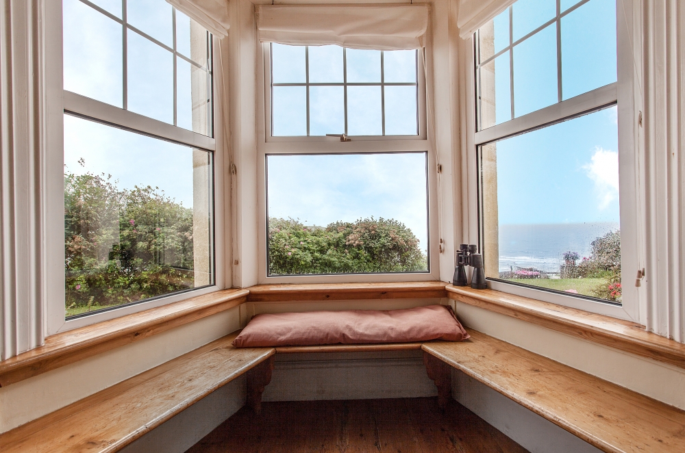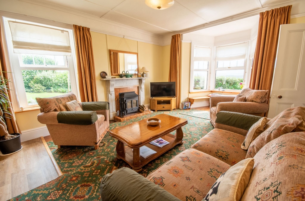 Lounge -(Freeview digital TV, sofas, wood burning stove, window seats looking out to sea)